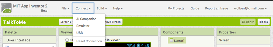 步骤3:打开AppInventor项目并将其连接到安卓设备